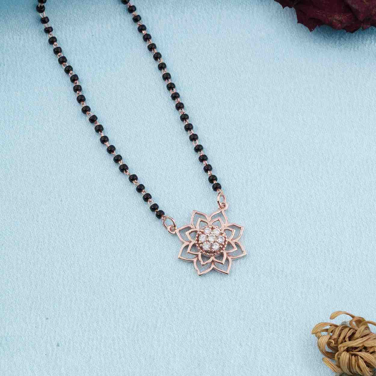 Your bridal jewelry selection and the color of your lehenga should complement one another. For instance, coloured stones go well with pastel lehengas. To get a classic yet regal look, wear our Rose Gold Starlight Zircon Mangalsutra with your coloured stone jewelry.