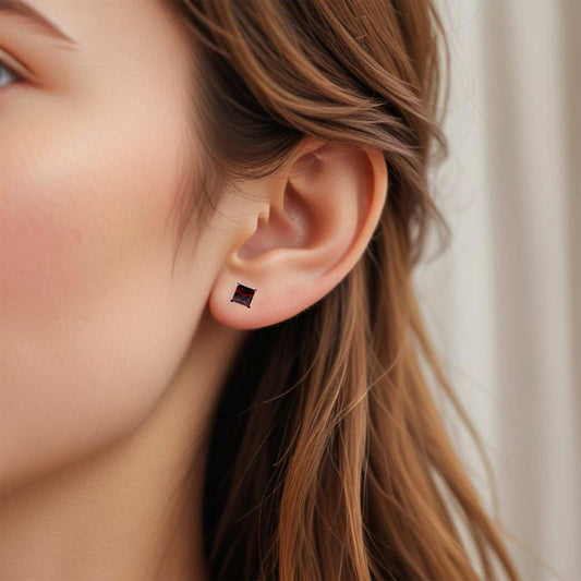 Silver Square Red Garnet Stud Earrings