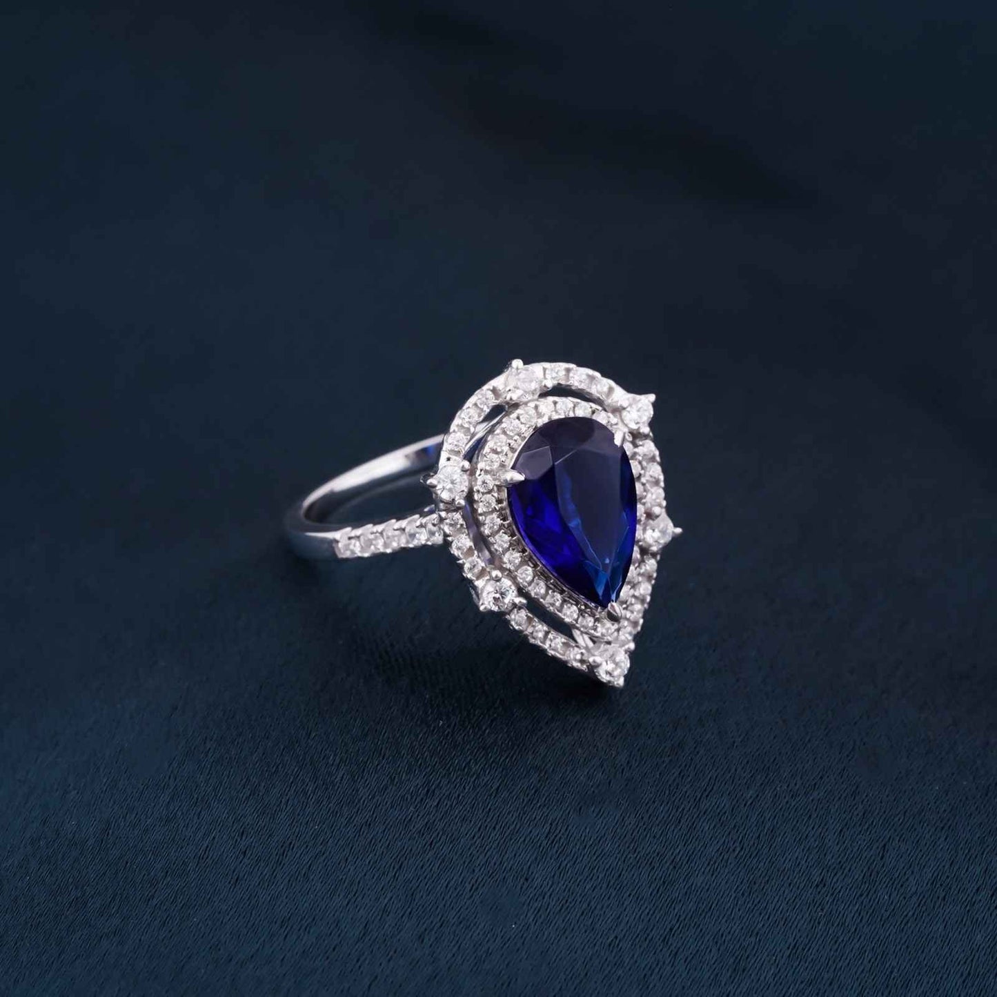 A radiant round moissanite meets a pear-cut sapphire’s deep embrace, crowned by a halo of light a timeless dance of fire and elegance.