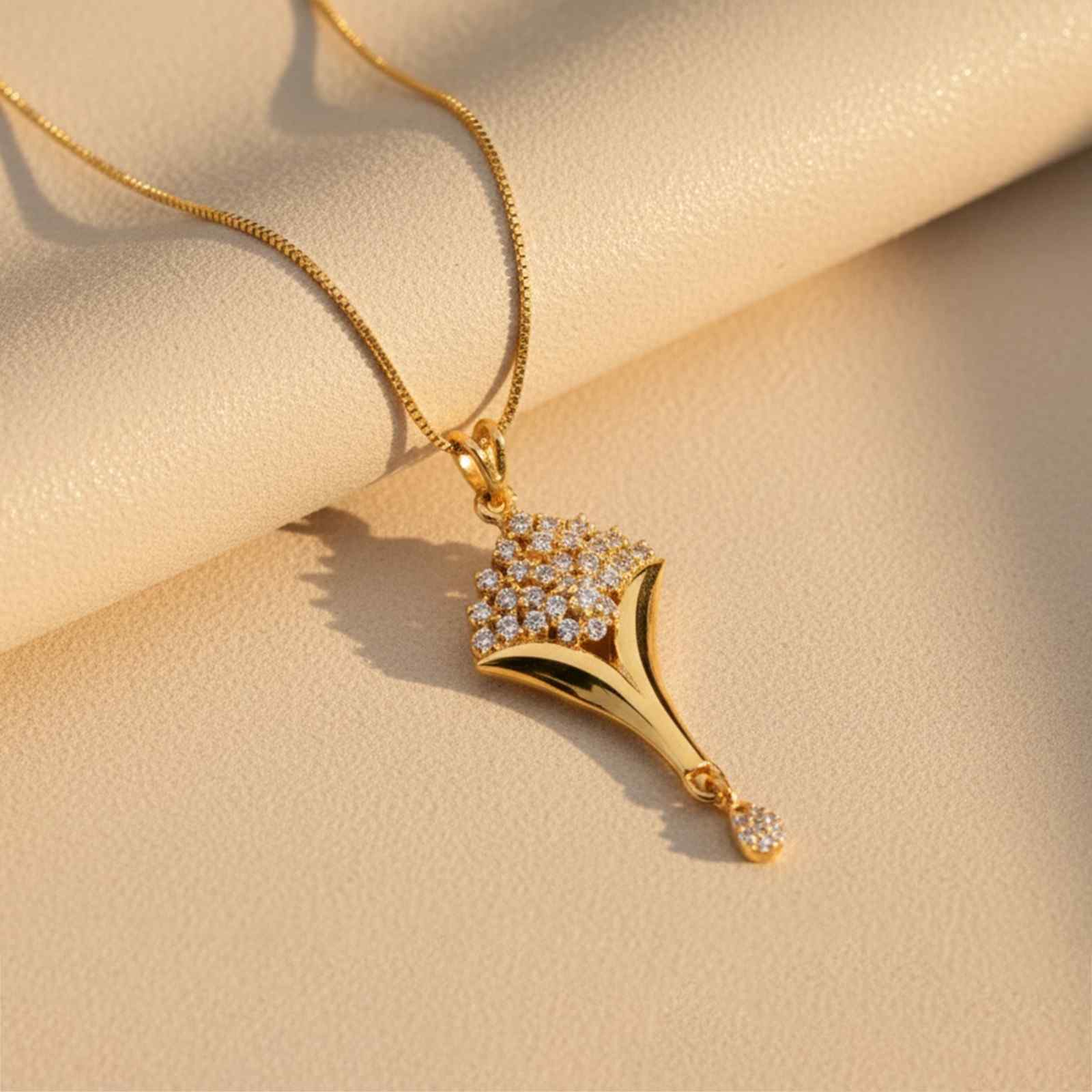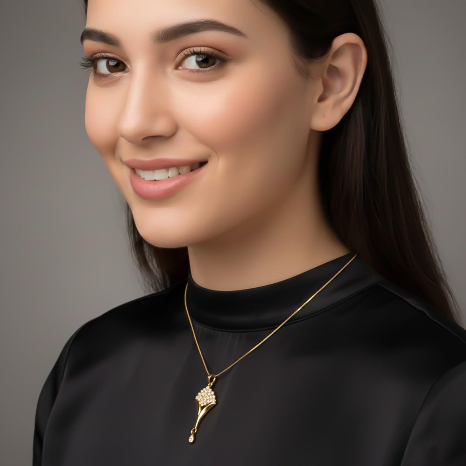 This stunning flower pendant is made of 925 sterling silver with 18K yellow plating and has a gorgeously carved bouquet structure that is covered with shining stones.