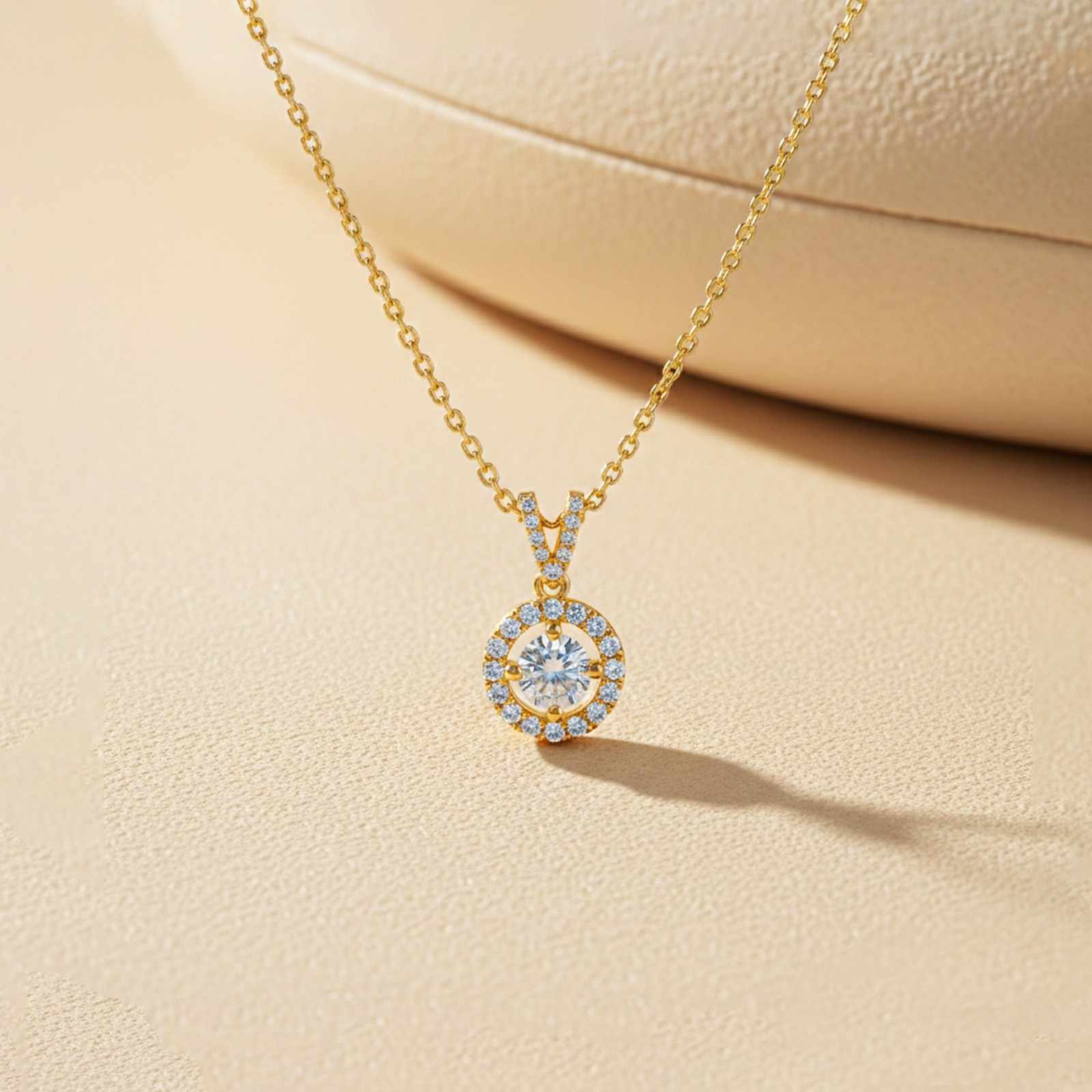 This golden pendant features a Compass motif studded with zircons. a perfectly paired loop with link chain.