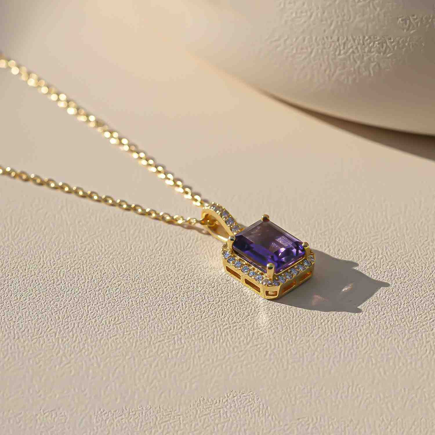 This design showcases a solitary emerald blue sapphire gemstone, beautifully surrounded by a halo of white swiss zircon. It pairs perfectly with a loop and link chain, all made from 925 silver with 18k gold plated.