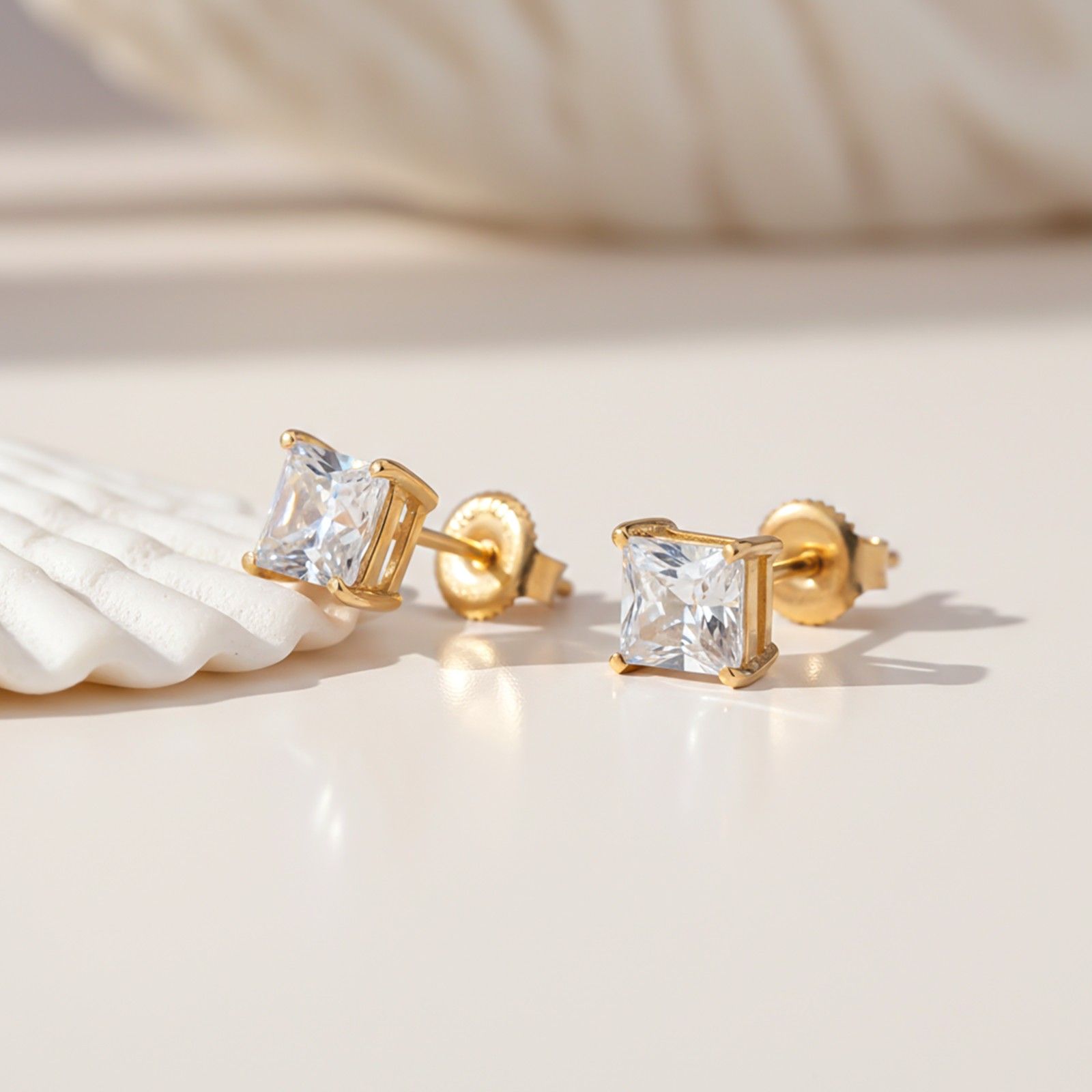 These golden stud earrings have a princess shape Single 4 prongs with a zircon placed on them. and secure with screw back.
