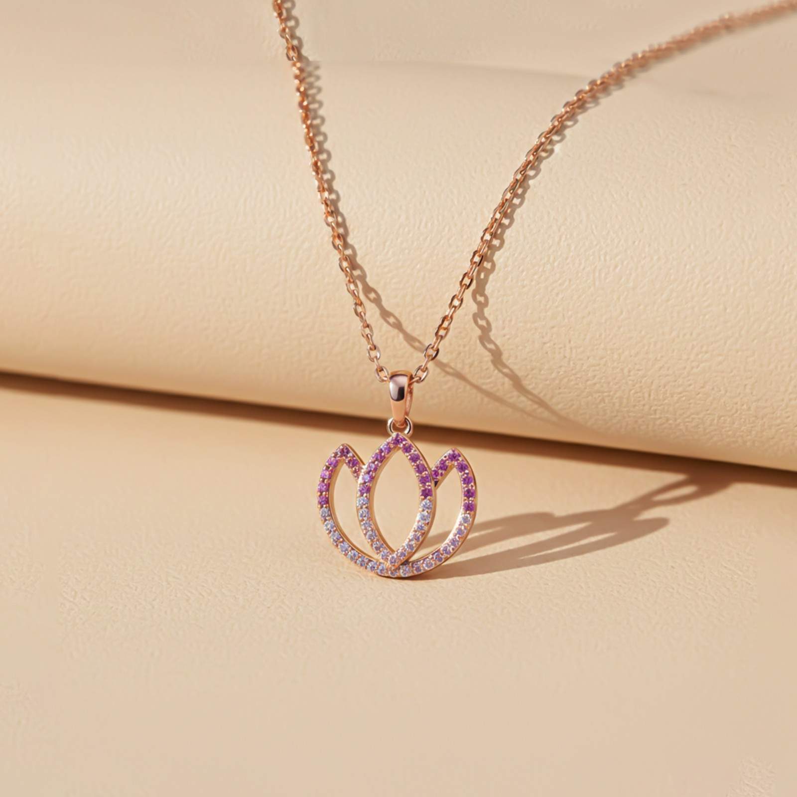 This design features a Varija (lotus) style pendant, studded with multicolored gemstones, paired with a chain and finished with 18K rose gold plating