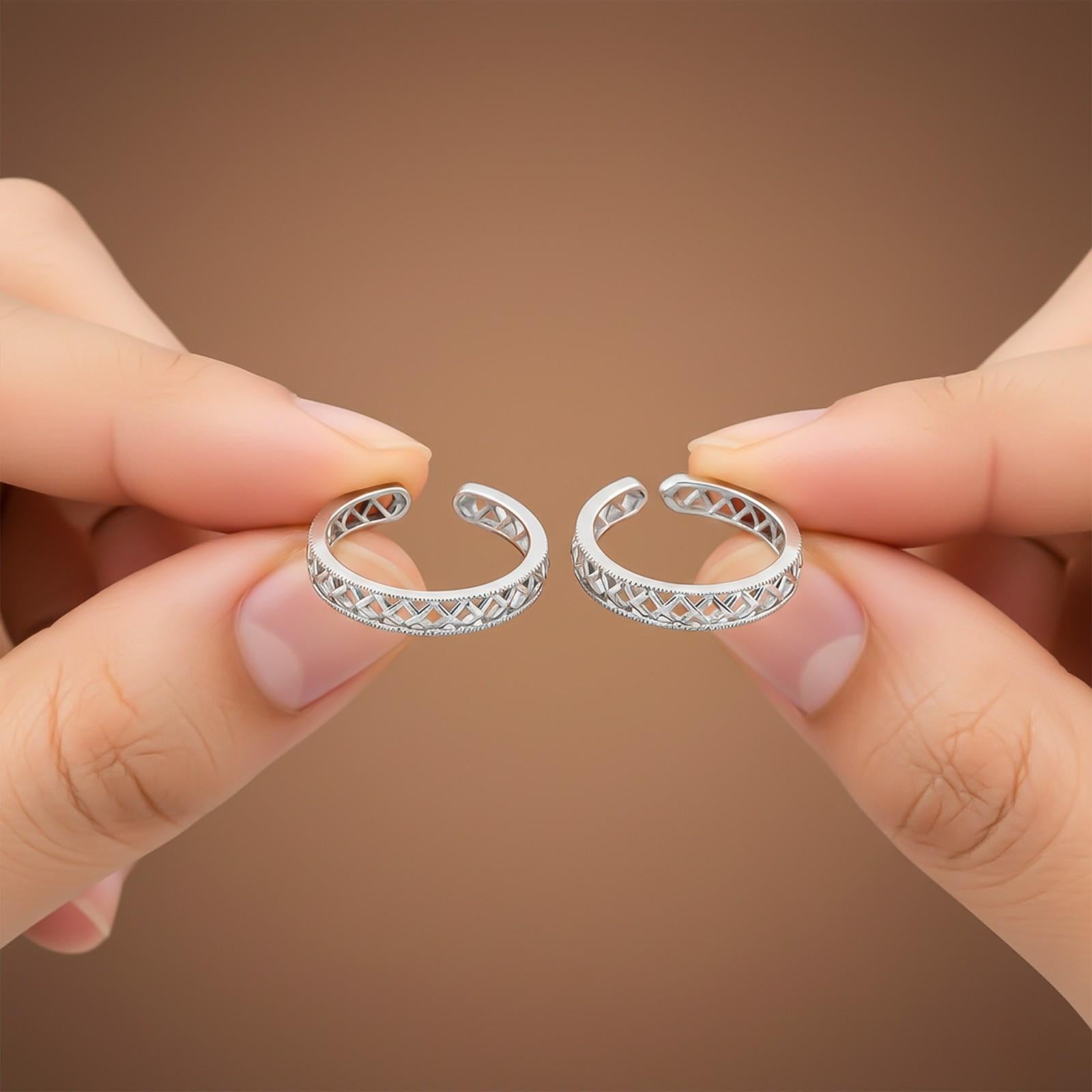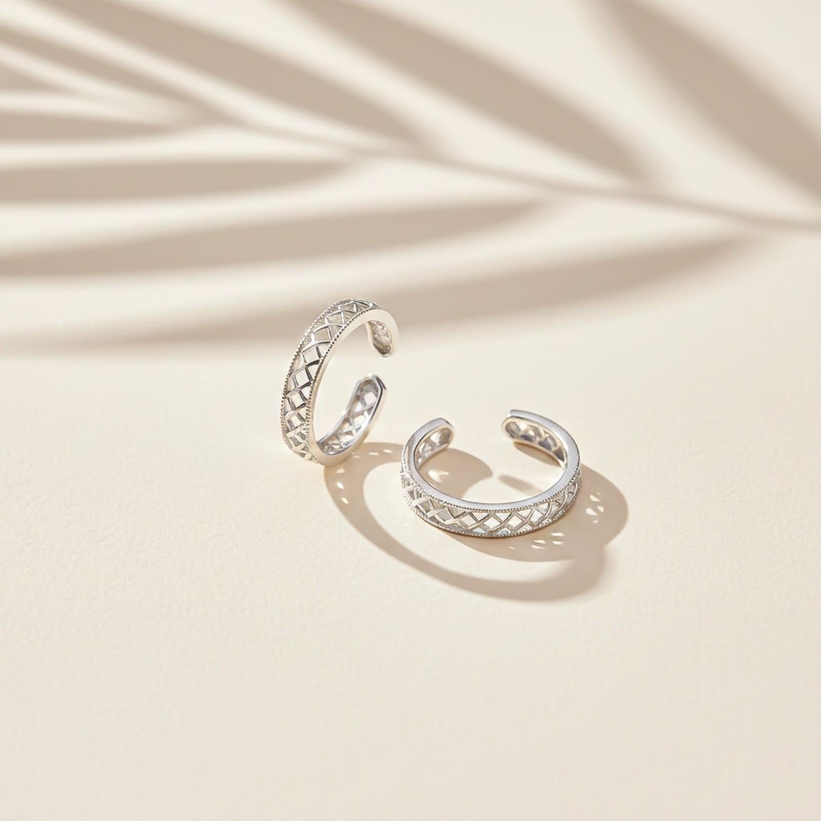 The Insight: Like a dainty flourish of beauty, the Silver Alluring Carvings Toe Rings are the perfect fit for any jewelry box or collection. These toe rings, skillfully made from sterling silver, have carvings etched on them that emit light, making for a shimmering effect with every movement.