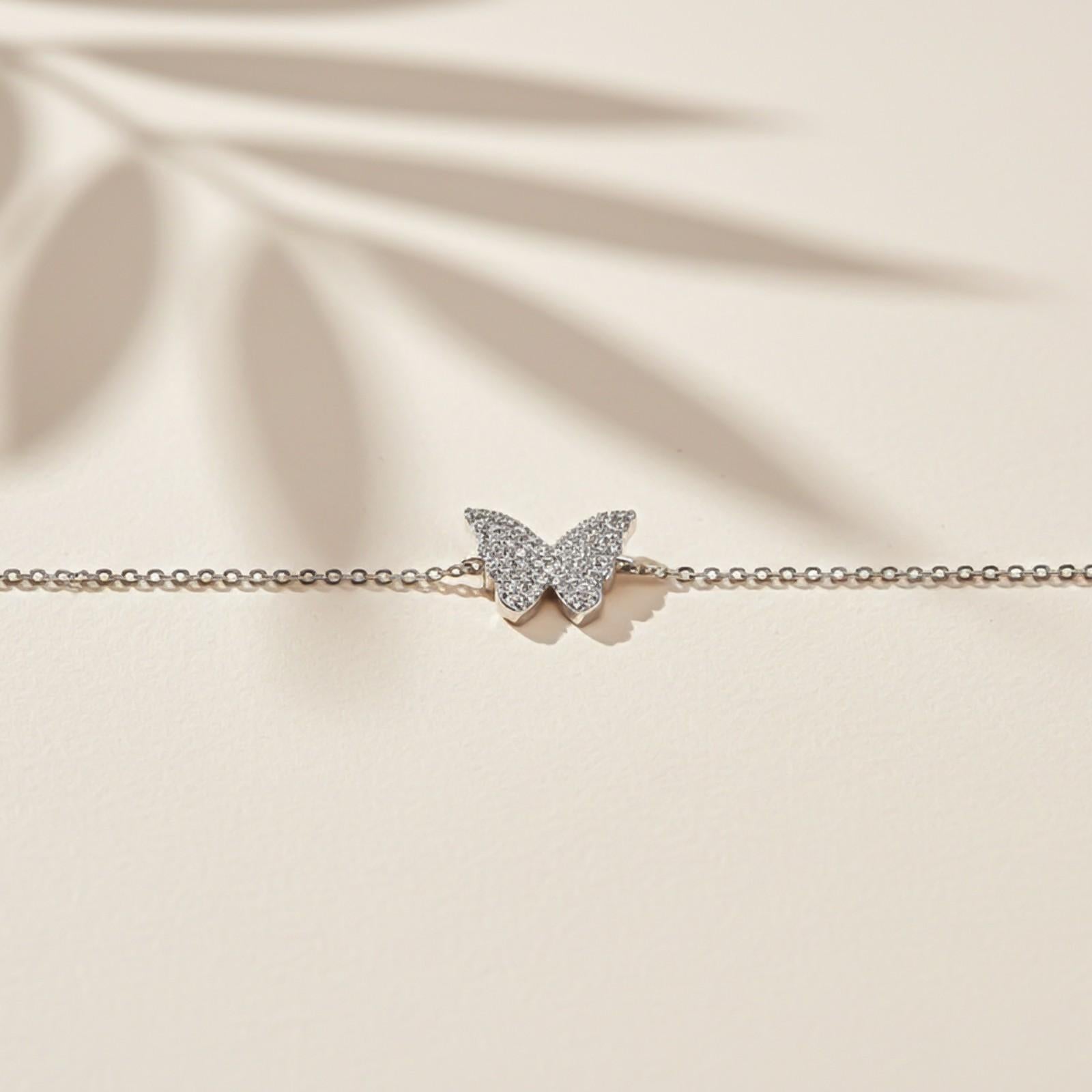 This silver bracelet features a butterfly charm motif studded with cubic zirconia (CZ). It is made from silver, with a spring ring closure and an added silver charm.