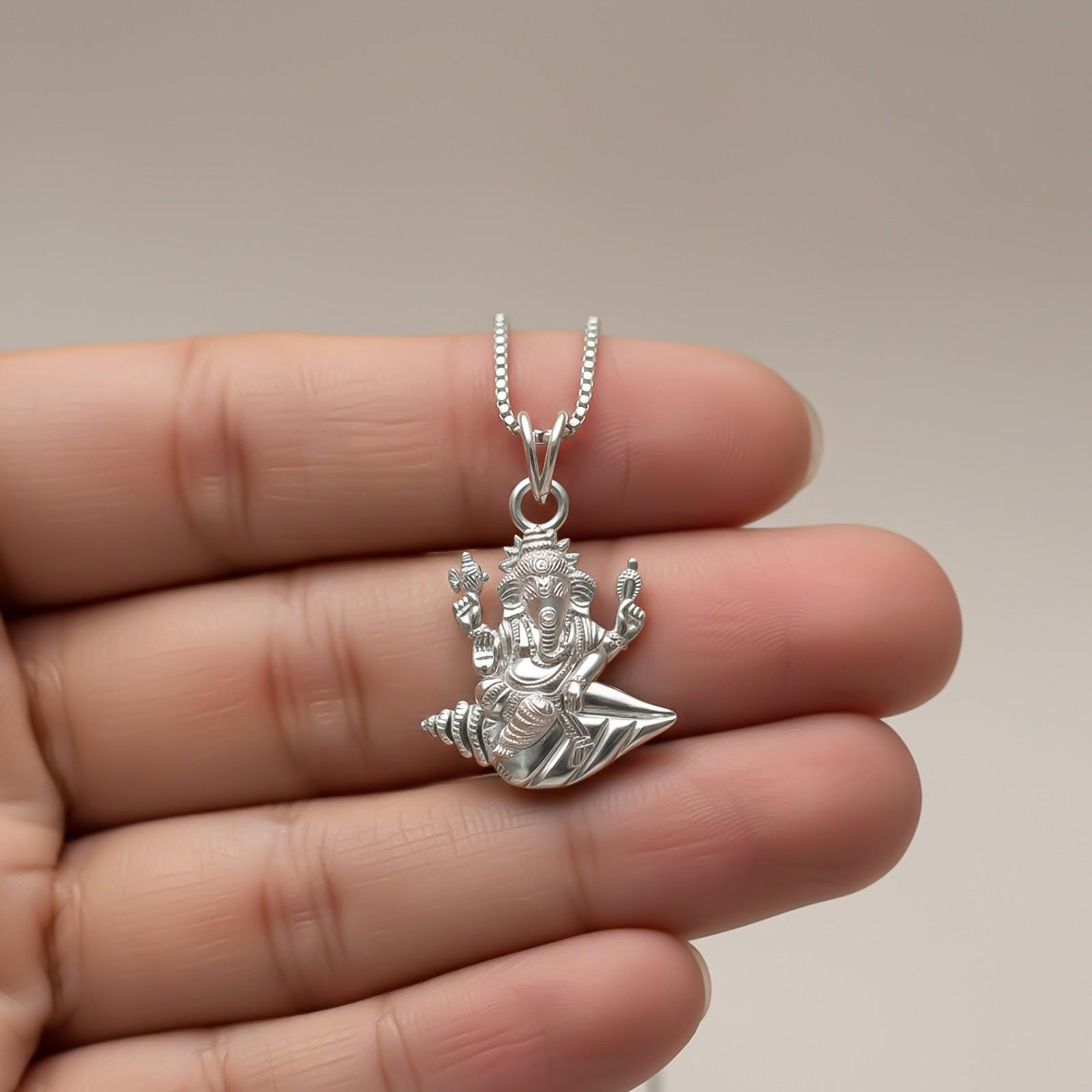 Deva Shree Ganesha Sitting On Shankh An Ensign of Sacred Knowledge and Wealth With our Silver Pendant, you can embrace the heavenly presence of Deva Shree Ganesha Sitting On Shankh . This magnificent piece of jewelry, which was created with great care and regard, invokes the blessings of the esteemed deity and is a potent emblem of wisdom, prosperity, and auspiciousness.