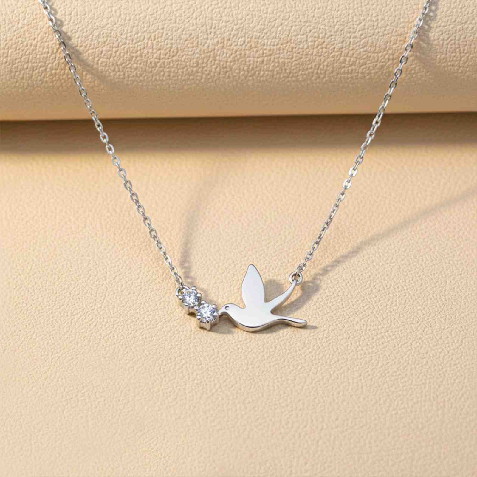 This silver necklace features, a flying pigeon in silver with 2 diamonds on side ,paired with a delicate chain all made from 925 sterling silver.