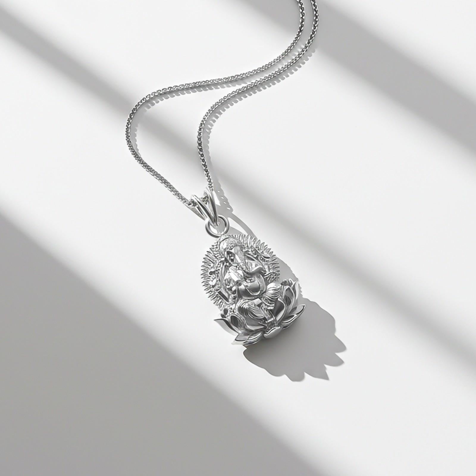 Crafted with utmost precision and attention to detail, this pendant is a perfect blend of elegance and religious symbolism. Adorned with a silver plating, it radiates a timeless charm that will surely captivate all who lay eyes on it. Embrace the divine energy and add a touch of spirituality to your ensemble with this Lord Ganesha Sitting On Lotus Pendant