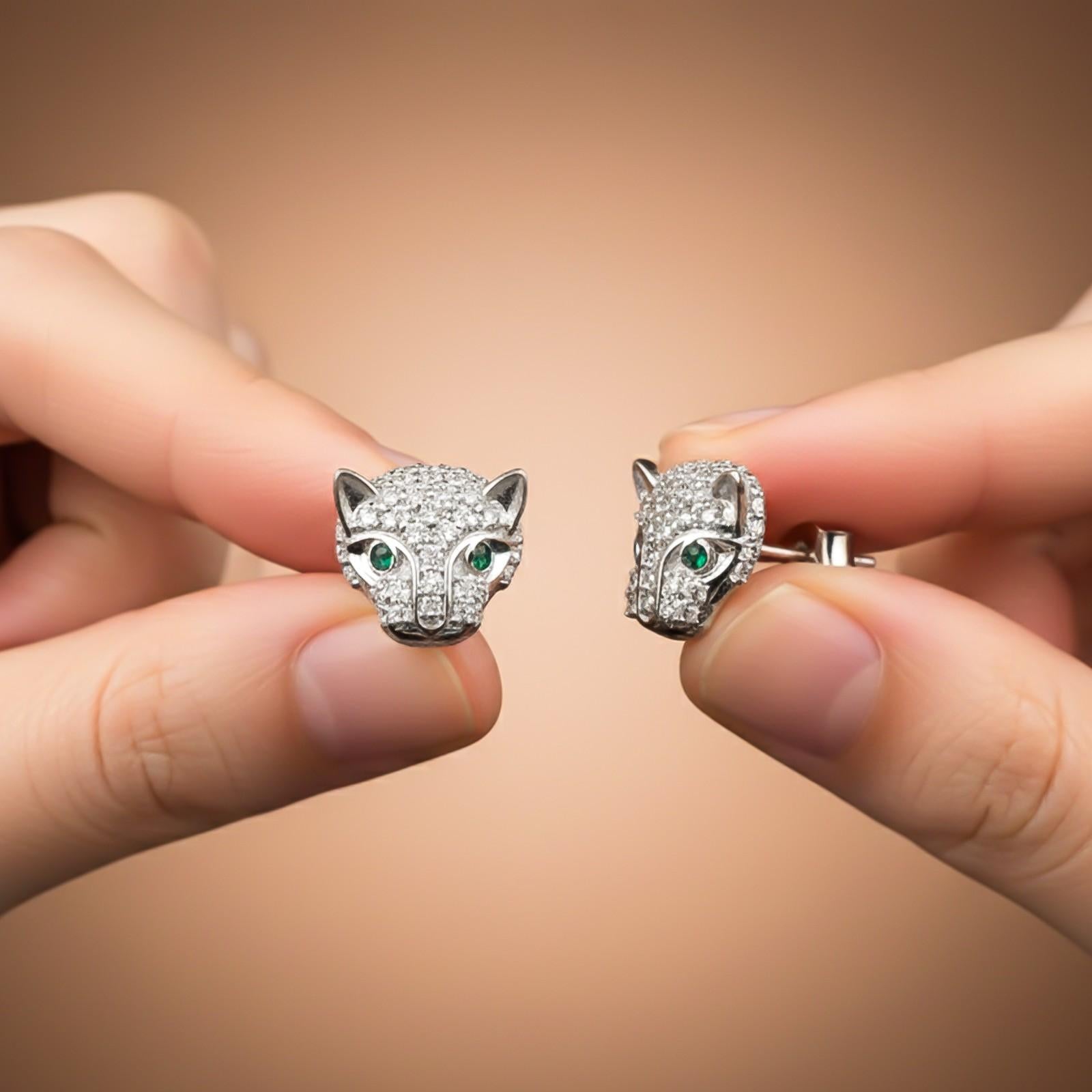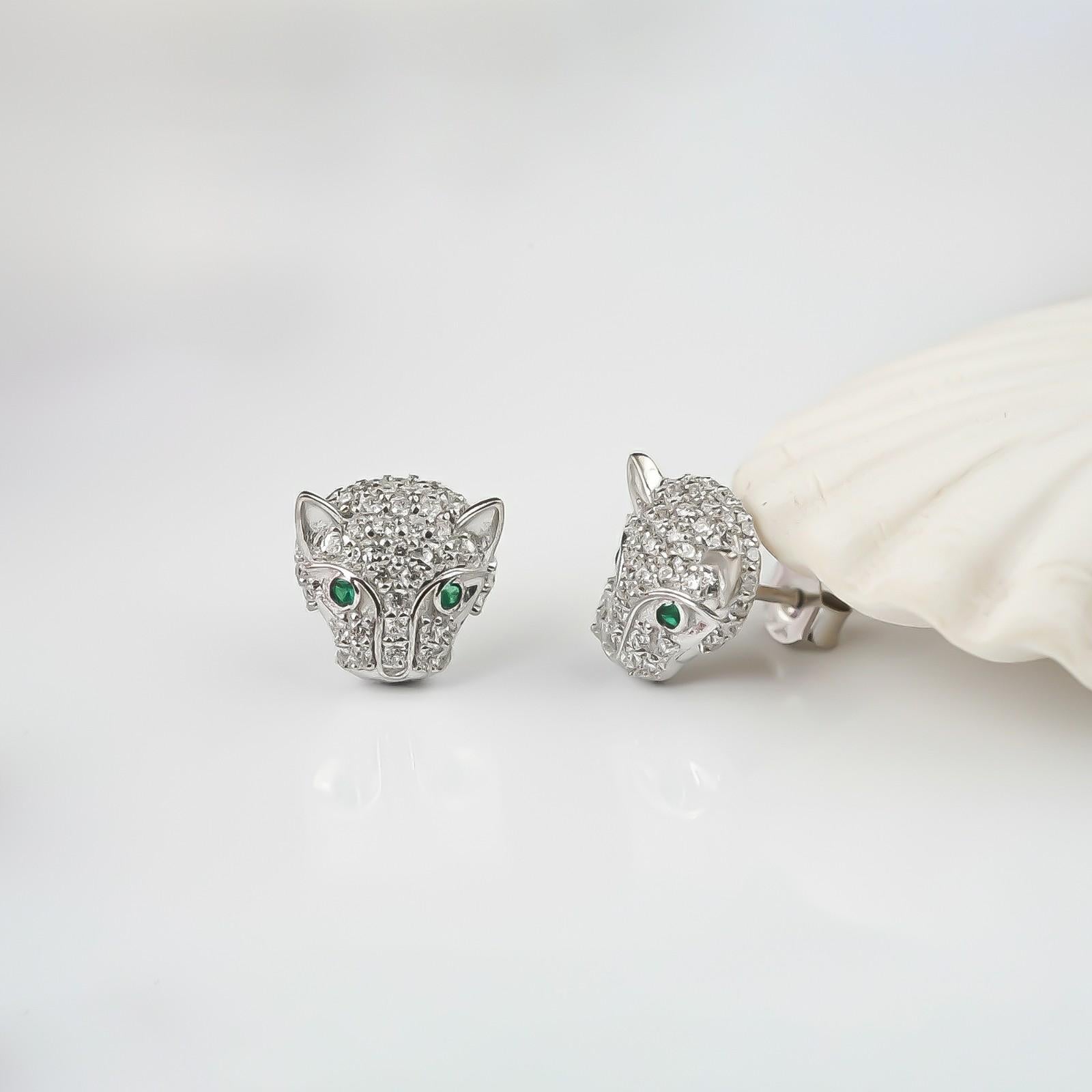 This silver earring features panther motif green emerald studded in eyes and rest is cz around the face is secured with a push back on closure.