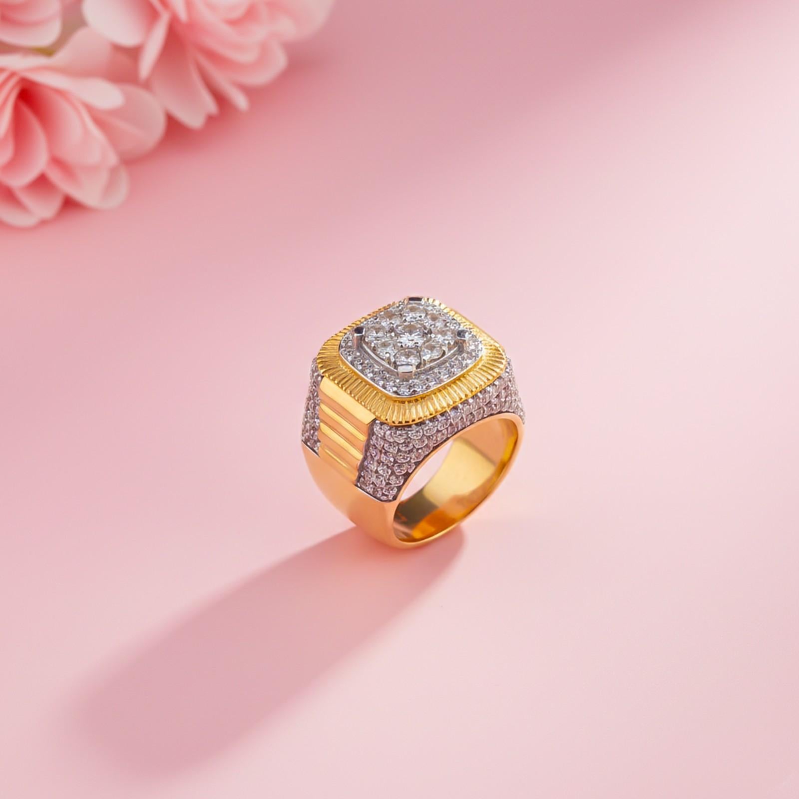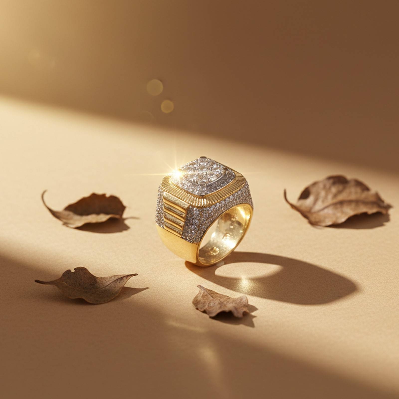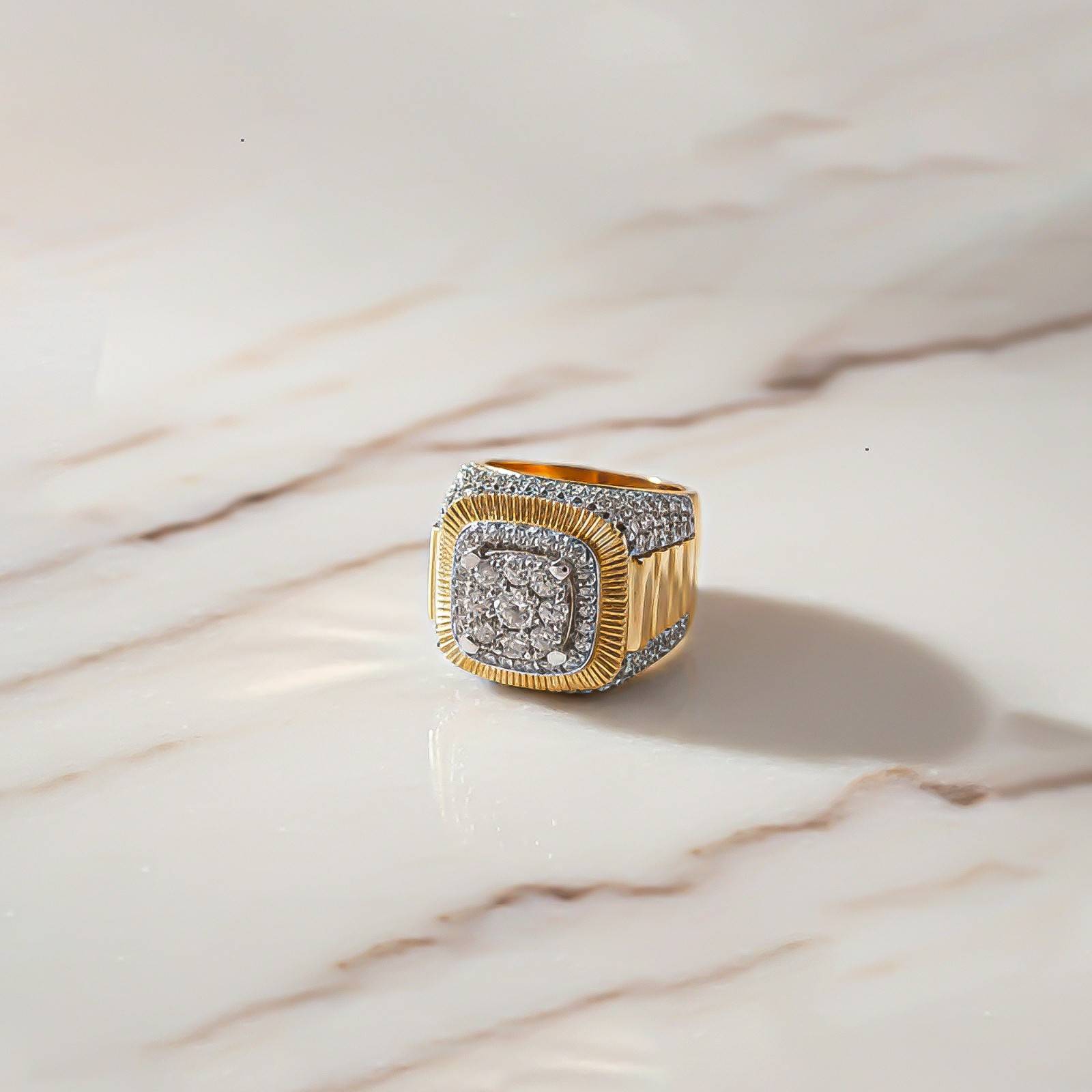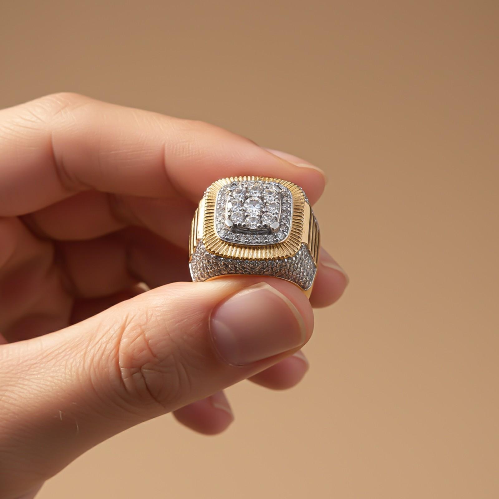 This silver ring showcases a bold hip-hop motif and features a wide shank, made entirely from 925 sterling silver with a stunning moissanite stone with gold plating finish.