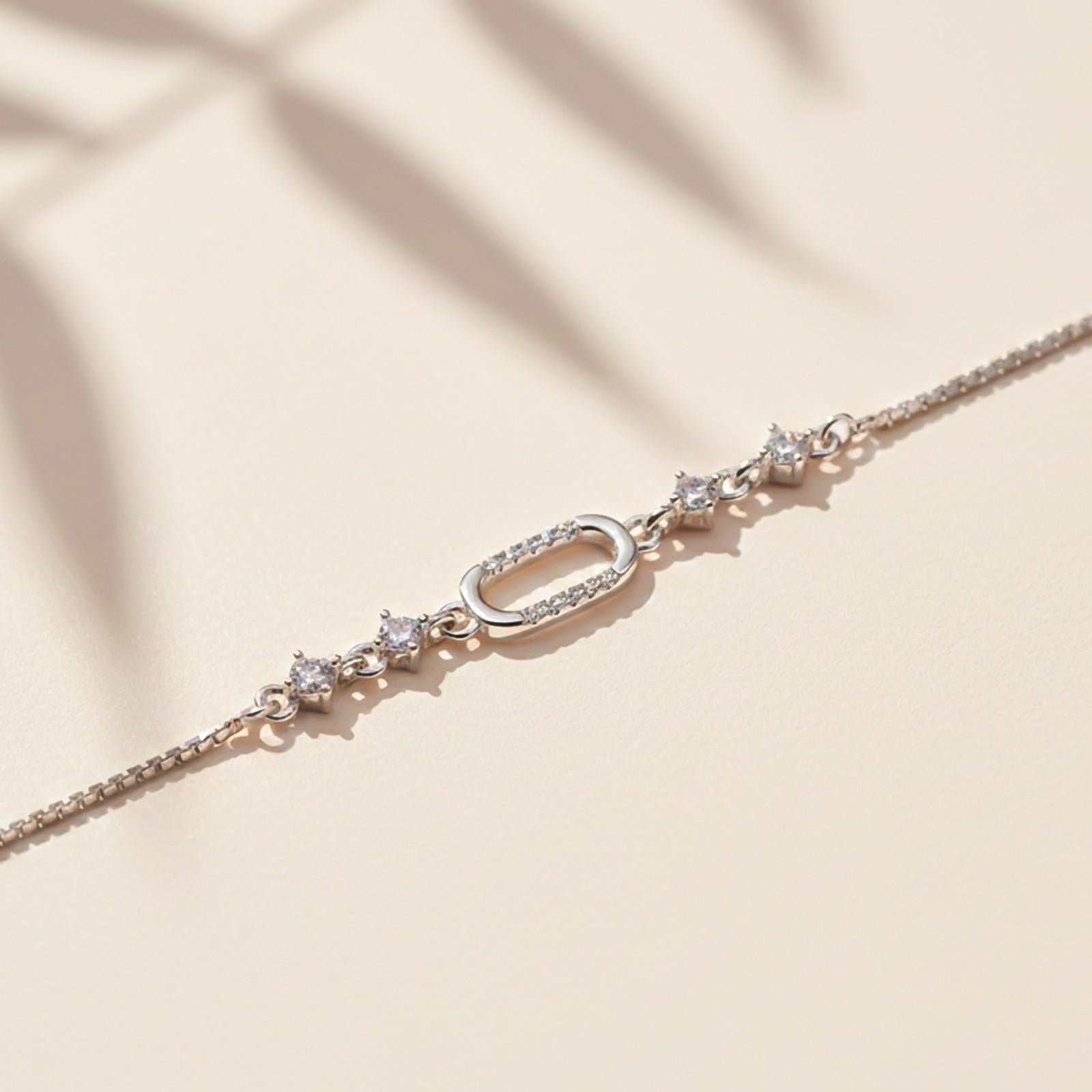 This silver bracelet features a Linked paperclip motif surrounded by 5 charms studded with cz made from silver, with a spring ring closure and an added silver charm.