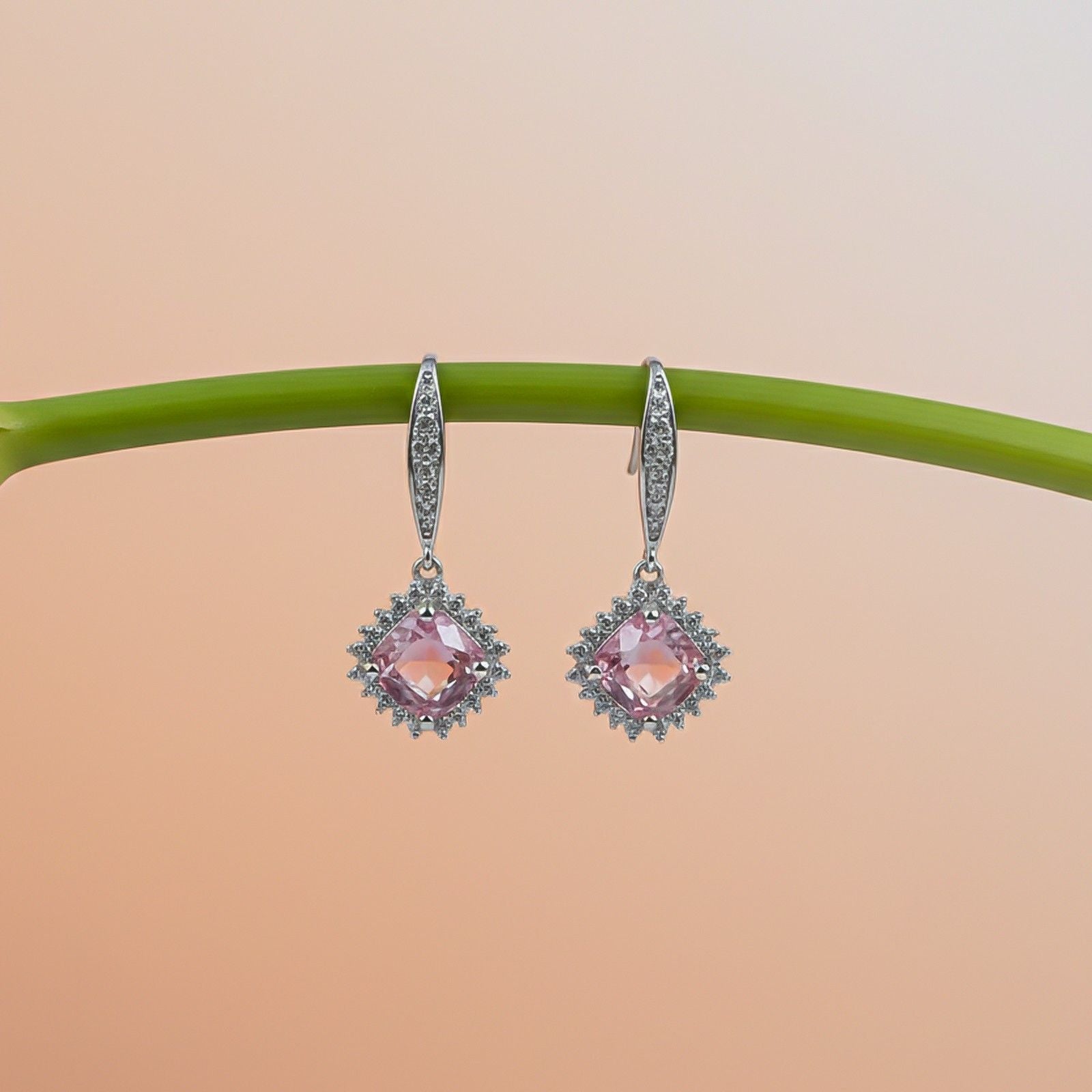 This silver earring features cushion stone in center with surrounded cz around it and secured with a Lever Back closure.