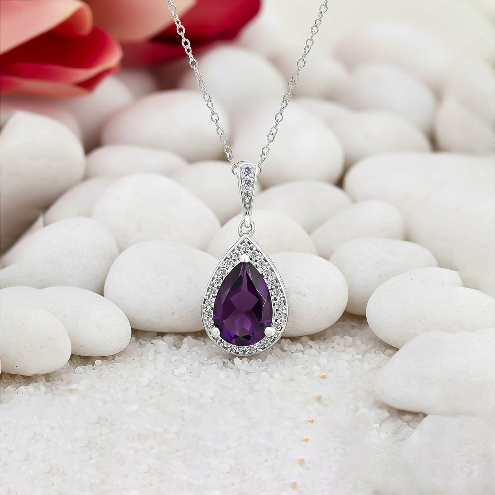 This pendant, made with precision and care, includes a stunning pear-shaped purple amethyst gemstone known for its deep and enticing shade. A halo of sparkling sterling silver envelops the bright center stone, amplifying its brilliance and adding a touch of elegance to any attire.