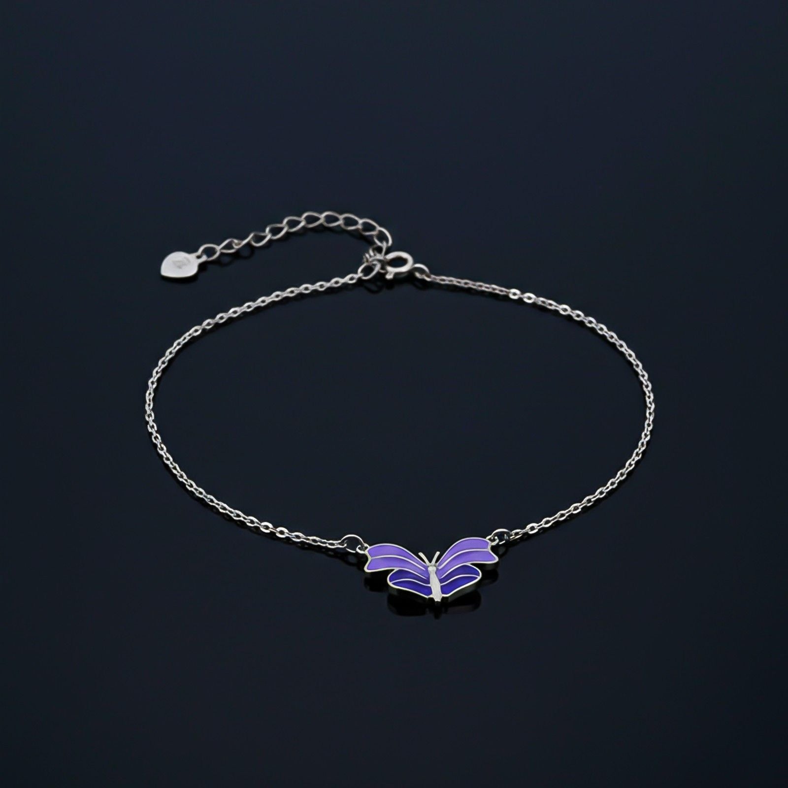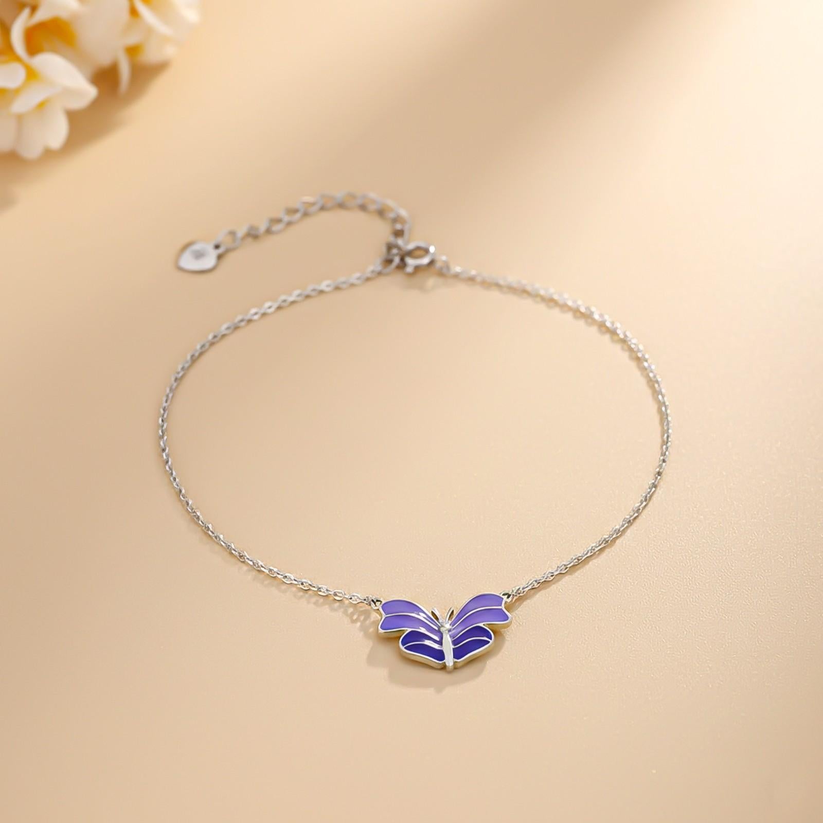 This silver anklet features a single butterfly set a purple enamel background, paired by a delicate chain and secured with a lobster claw clasp, all made from 925 sterling silver.