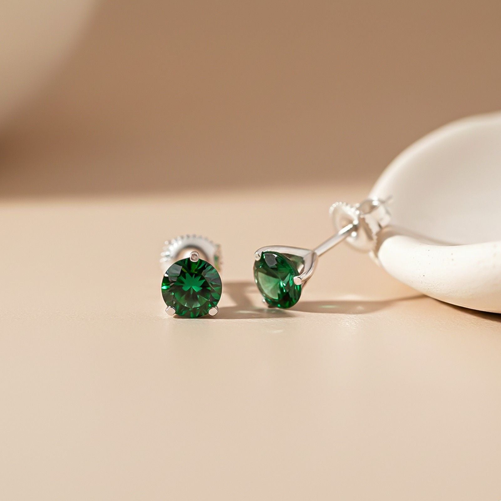 These silver stud earrings have a round shape with a emerald placed on them. and secure with push back.