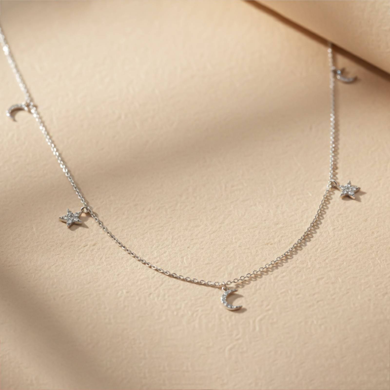 Adorn yourself in the whispers of the night, where silver stars kiss the moon, crafting a tale of cosmic wonder around your neck.