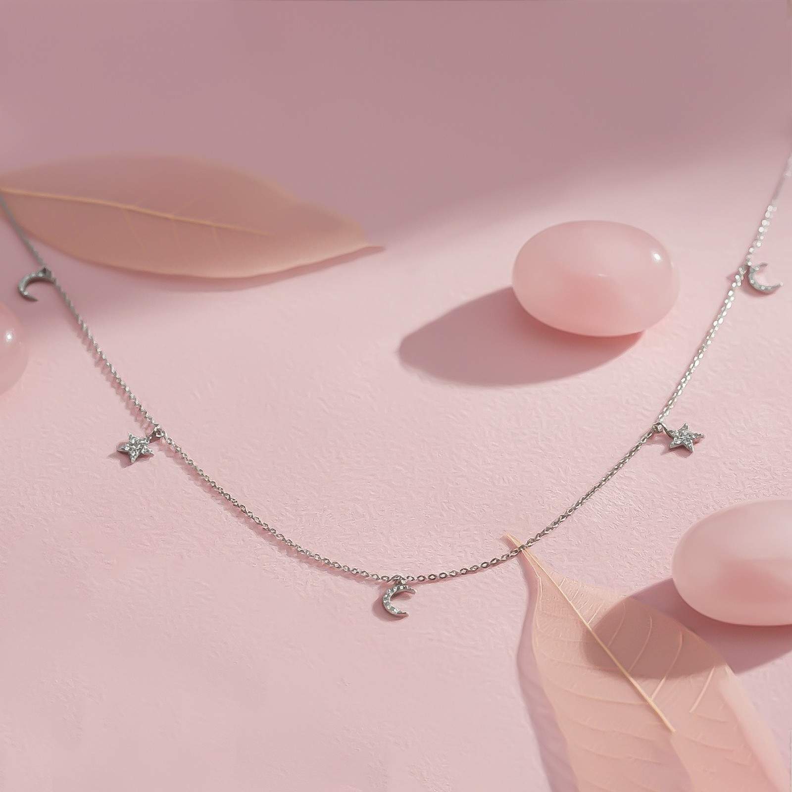 This silver necklace features Moon and star mini charms with studded CZ, paired with a Link chain, all made from 925 sterling silver.