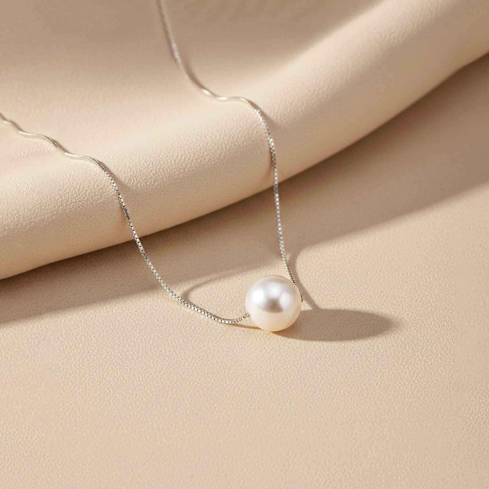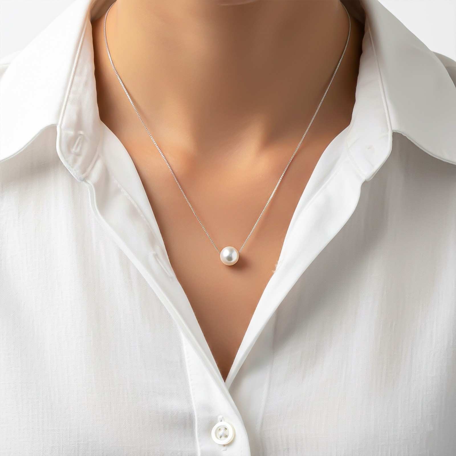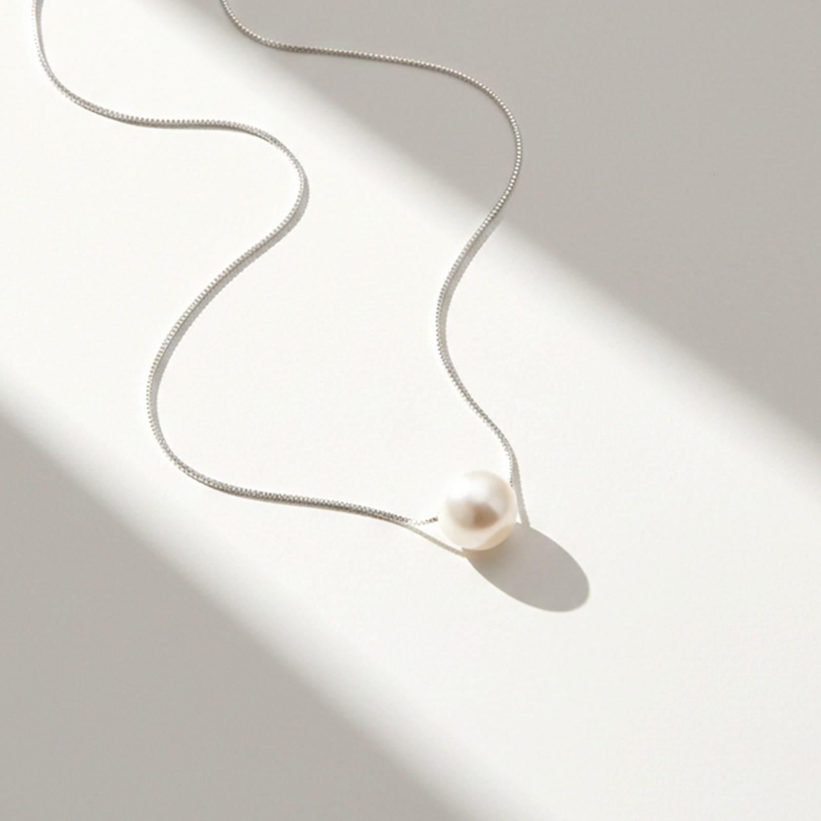 A perfect pearl necklace that reminds you of the full moon, showering its light all over. This is a luxurious and timeless pendant that you'll wear for years to come! This silver chain passes through a pearl pendant. Suit this with a dark purple maxi dress.