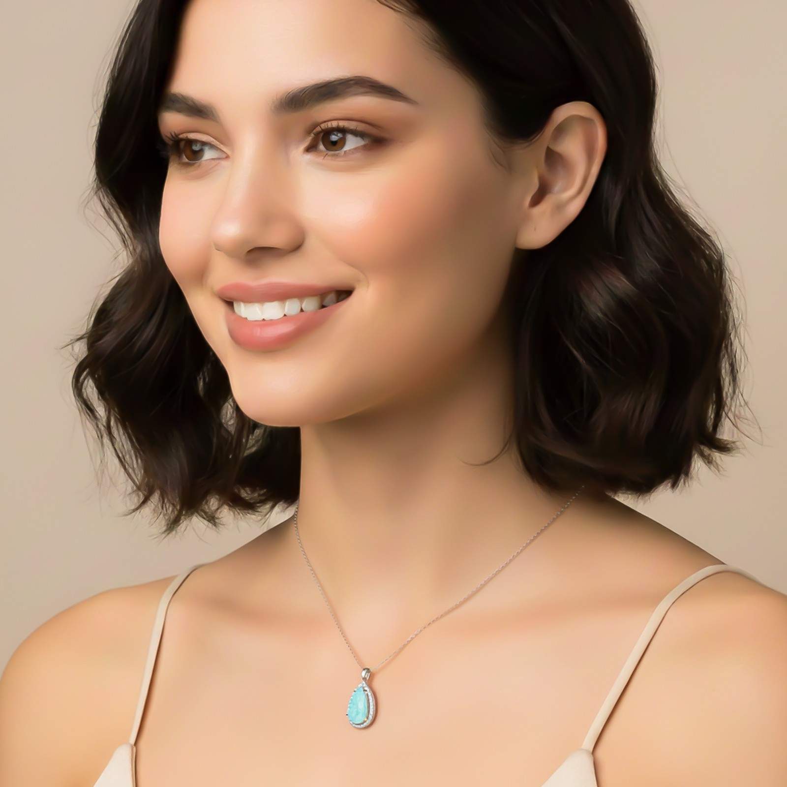 White Opal Teardrop Pendant, a stunning piece that effortlessly combines opalite and diamonds. This pendant showcases a mesmerizing white opal teardrop, radiating an ethereal glow that captivates the eye.